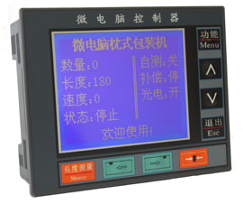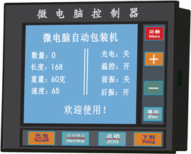 公司后续开发出以步进电机为核心的立式包装机控制系统,先后有:数码管、小液晶屏(128×64)、大液晶屏(160×128)、彩色触摸屏等控制系统。